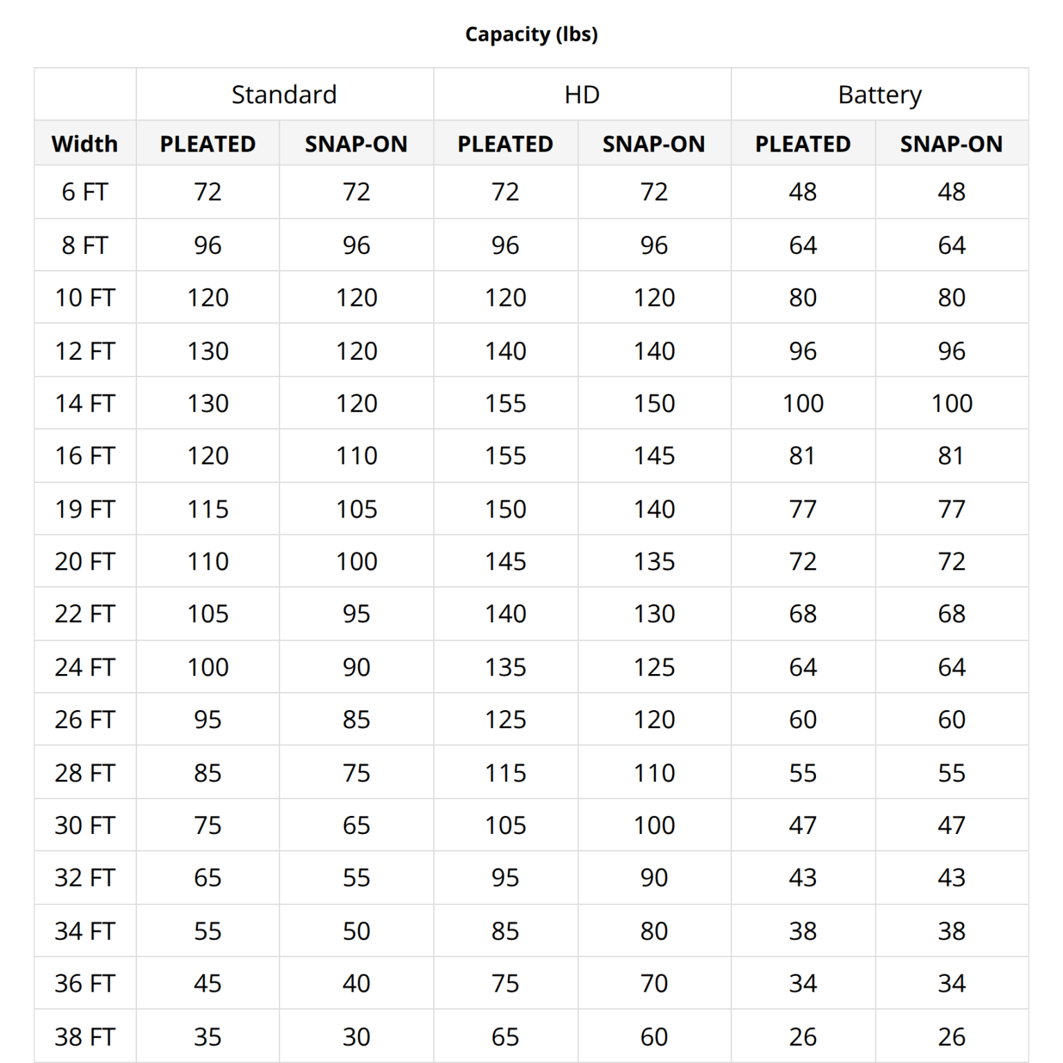 | Width | 6 FT, 8 FT, 10 FT, 12 FT, 14 FT, 16 FT, 19 FT, 20 FT, 22 FT, 24 FT, 26 FT, 28 FT, 30 FT, 32 FT, 34 FT, 36 FT, 38 FT |