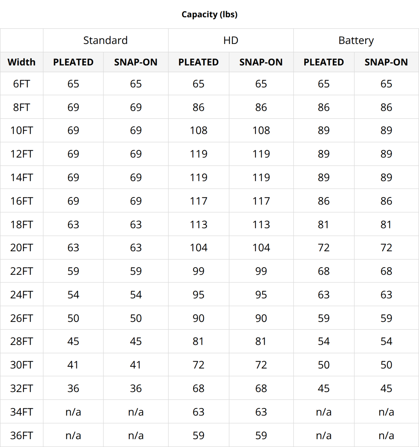 • Maximum drapery weight listed in Ibs for centre-split straight track.